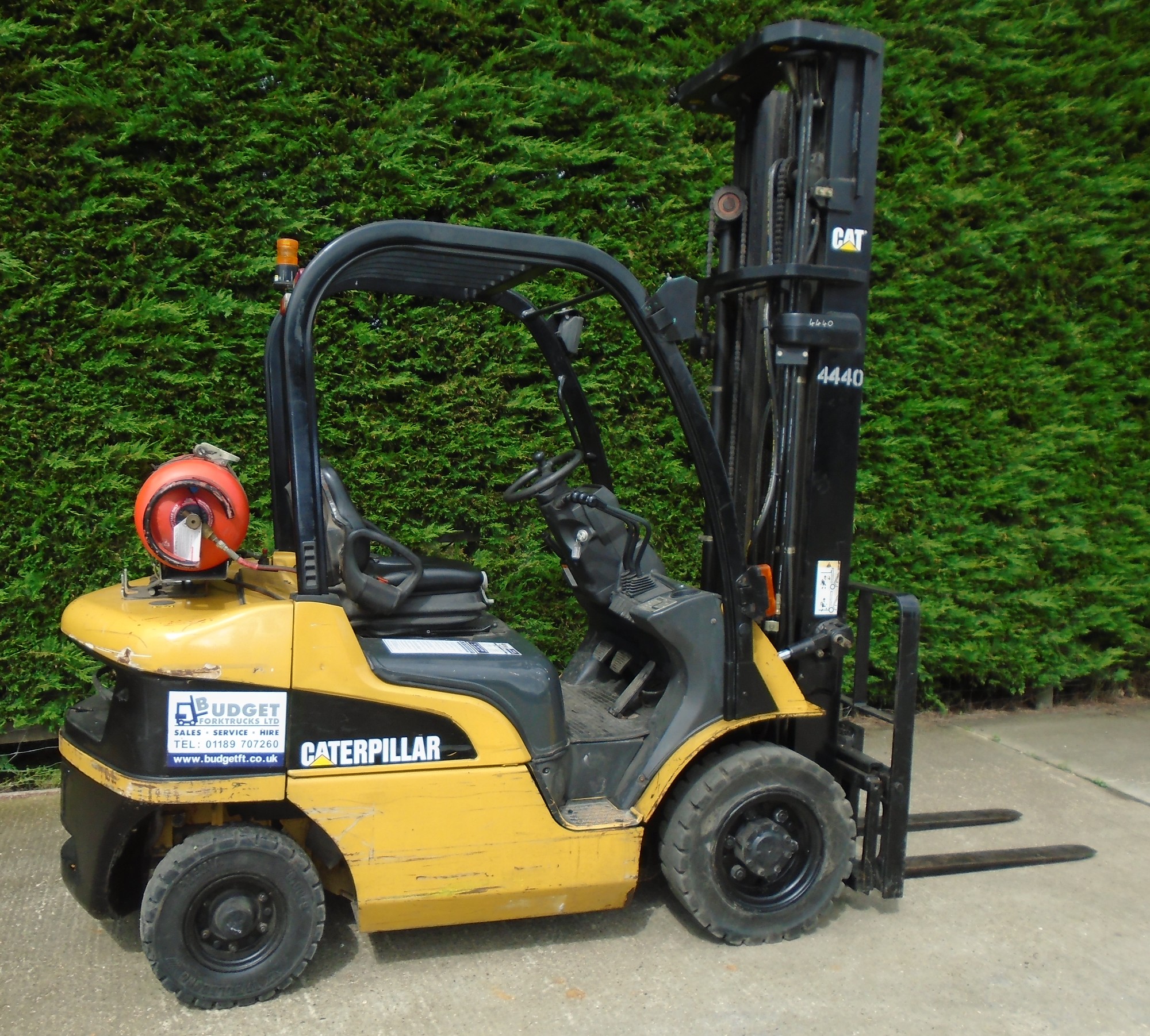 4440 Cat GP25N 2500kg Gas counter balance with sideshift 6500mm lift height & closed height of 2820mm.