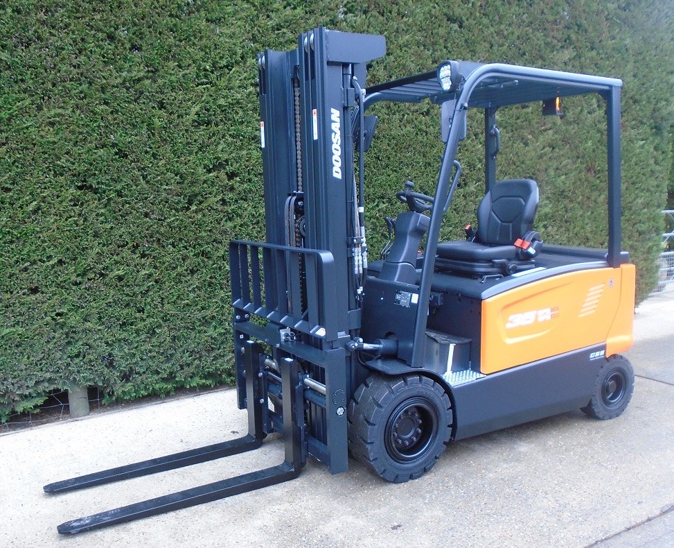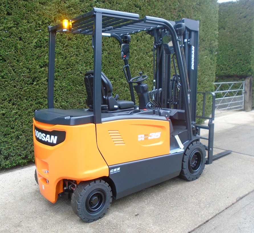 New Truck 5593 DOOSAN B35X-7 4 wheel electric forklift with 4820mm lift height triplex mast & sideshift.